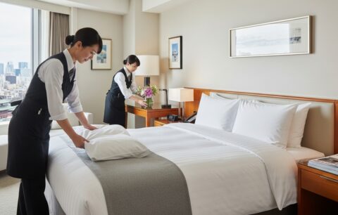 ホテルの客室清掃では、清掃後の備品配置やセットアップの精密性が特に重要になります。