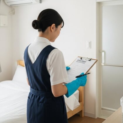 ホテル客室清掃は、同じ間取りの客室が多数あるため、「一度決めた動線を水平展開しやすい」のが特徴です。一方、民泊清掃は物件ごとに構造が異なるため、「物件単位のカスタマイズ」と「共通ルールのバランス」が重要になります。